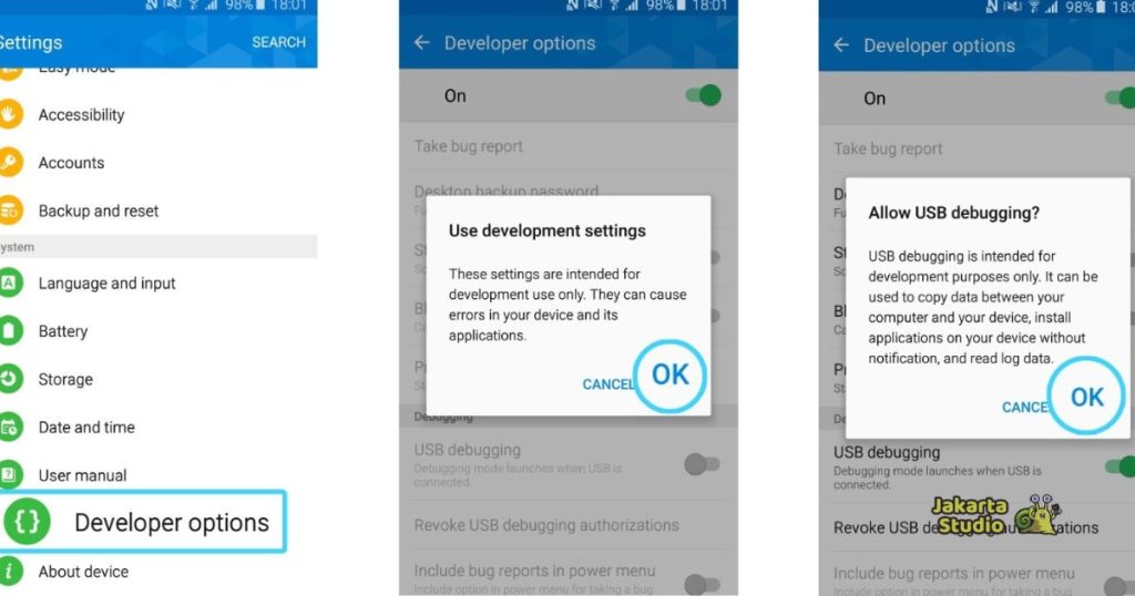 - Memastikan opsi USB Debugging dalam keadaan aktif di pengaturan